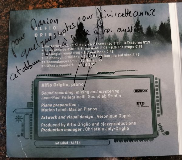 Alfio Origlio nous livre ici une musique épurée alternant les compositions originales : Nuna, Ascendances, Ennio Émoi, et les musiques arrangées : La Javanaise, Invitation, Textures, et même de la musique de Bach et Monteverdi…