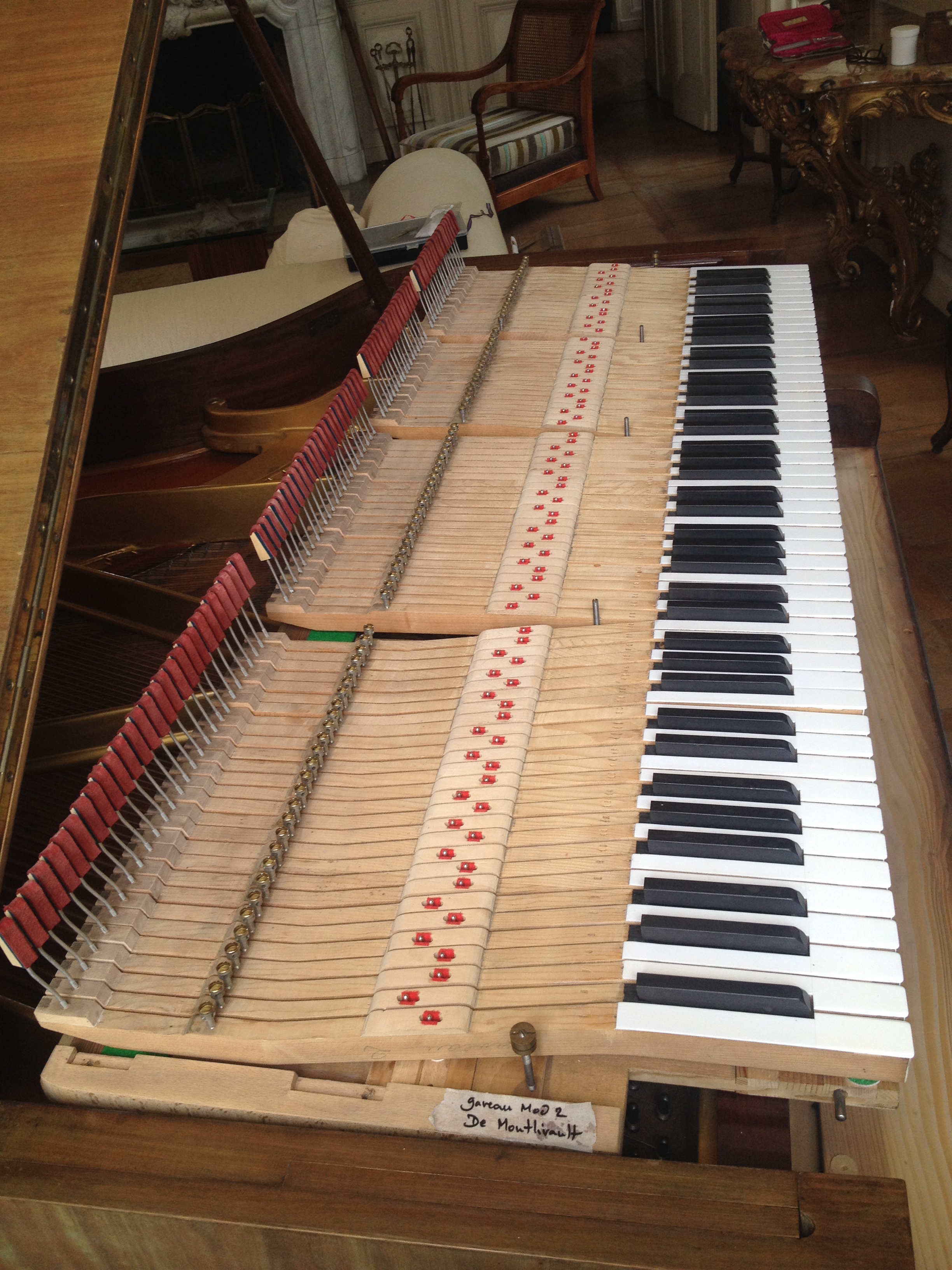 Cet instrument a bénéficié d’une restauration complète comprenant le flipotage et le revernissage de la table d’harmonie, la fabrication d’un nouveau sommier “à façon” en érable du Canada, le remplacement et regarnissage de toutes les pièces mécaniques, la préservation de l’ivoire et de l’ébène du clavier, le vernis gomme laque naturelle au tampon.